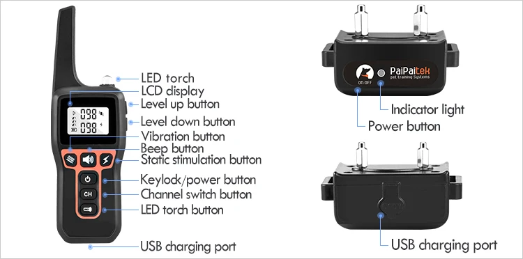 Package Includes: Receiver Collar, Remote Transmitter, USB Charging Cable, Reflective Nylon Collar, User Manual